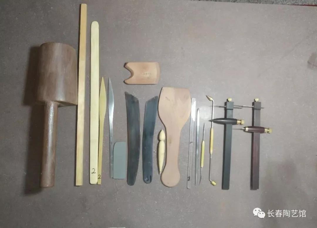 这只是工具的一部份哦,后期打磨会用到更多工具的,这上面从左到右是:搭子、墙尺、泥条尺、竹鳑鲏刀、铁鳑鲏刀、搪盖石、大明针、小明针、 (上) 篦子、独果、拍子、嘴把架、铁尖刀、挖嘴刀、未被命名的常用家什 、规车、墙车。