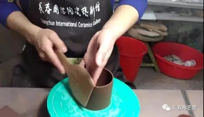 做围做底  用规车切出一个圆形的泥片,用墙车切除出身筒所需的泥条,切掉多余的部分,将接头粘结在一起。